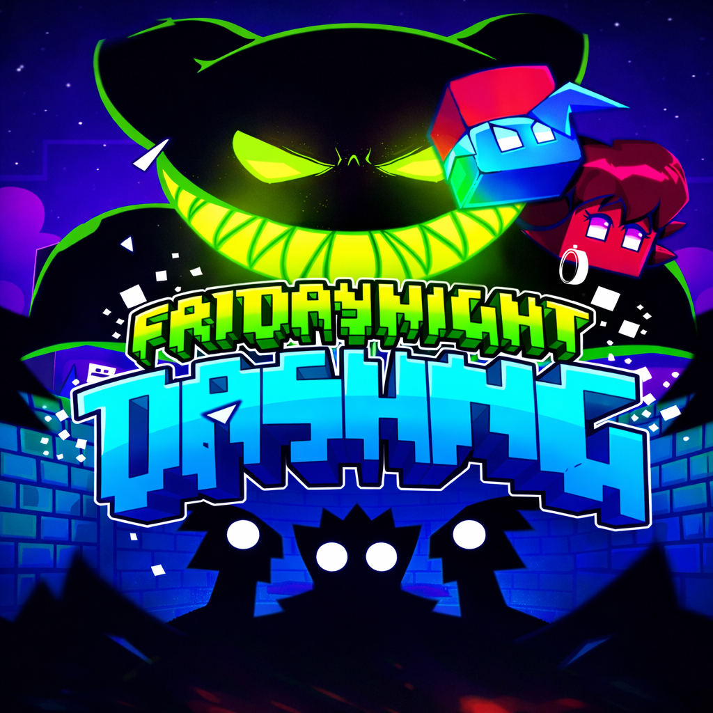 Friday Night Dashing blends the musical battle style of Friday Night Funkin' with the visual identity of Geometry Dash. In this crossover concept, Boyfriend and Girlfriend travel through a portal into the geometric universe. Instead of platforming challenges, the conflict is settled through rhythmic duels. The result is a unique mix of rap battle mechanics and Geometry-themed presentation.